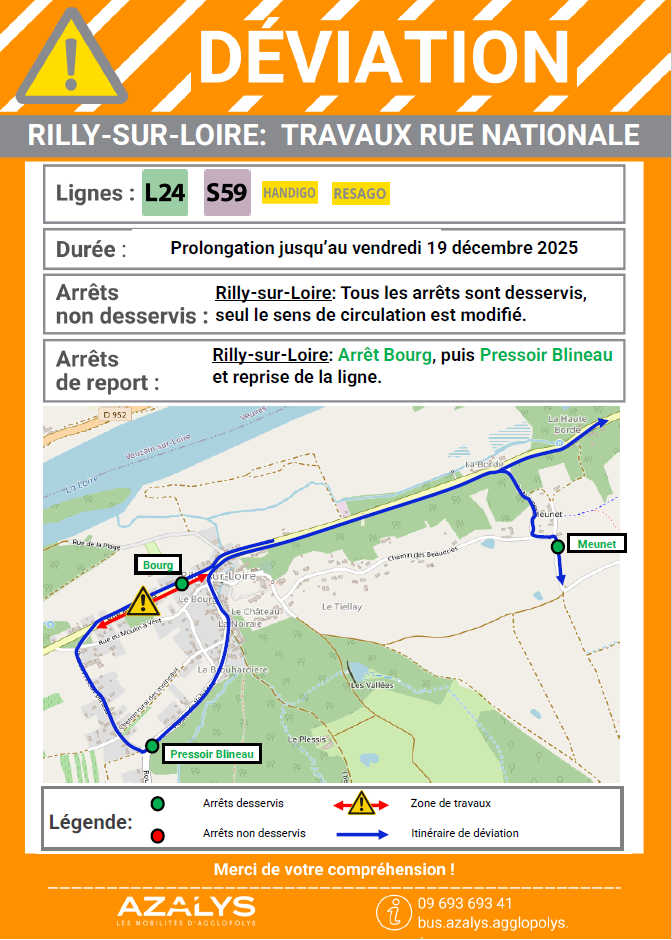 Du 18 novembre au 19 décembre 2025 inclus, en raison de travaux route de Sainte-Boyne à Lombreuil, l'arrêt Lombreuil Mairie est déplacé au stop du bout de la route de Vimory.
