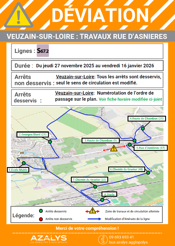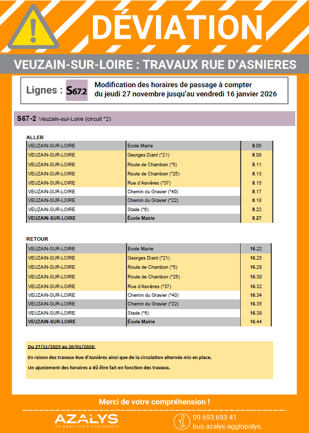 En raison de travaux annoncés rue de Saint-Martin à Plaimpied à partir du lundi 29 septembre 2025 pour une durée d'environ 3 mois, les circuits scolaires PG204, PG205 et PG210 sont déviés.