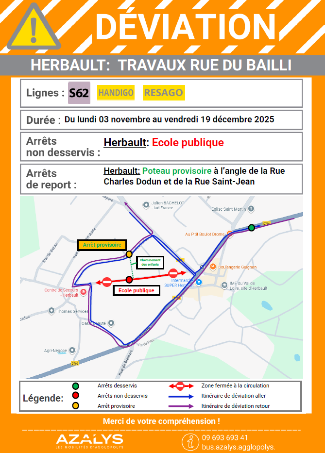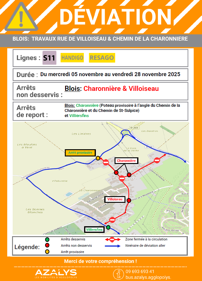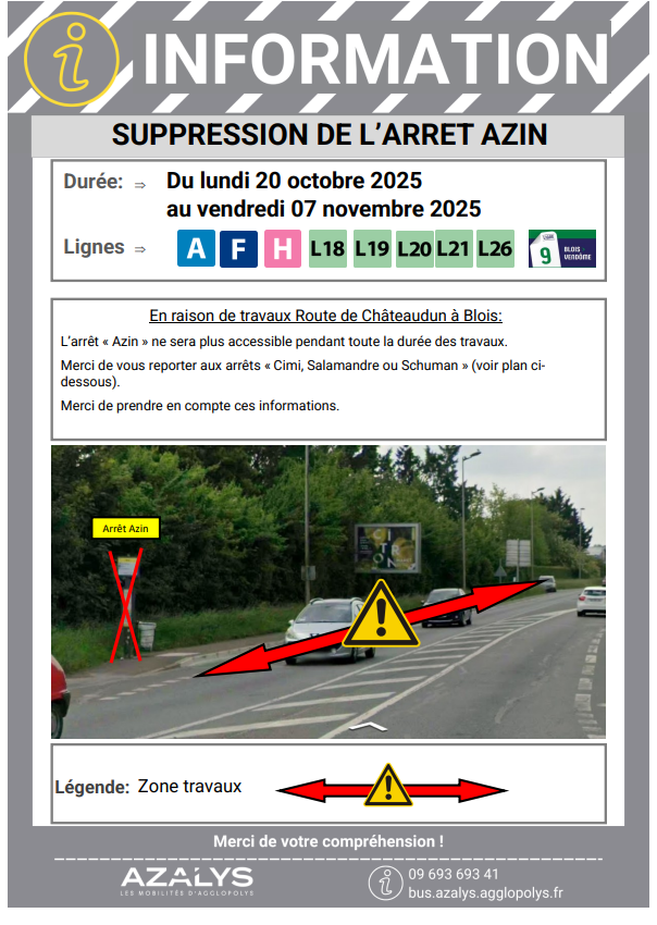 En direction d'Issoudun la circulation est interdite du 3 au 5/11 de 20h à 6h15. Les bus empruntent le même itinéraire de déviation en desservant l’arrêt provisoire route de La Chapelle le long de l’église St-Henri.